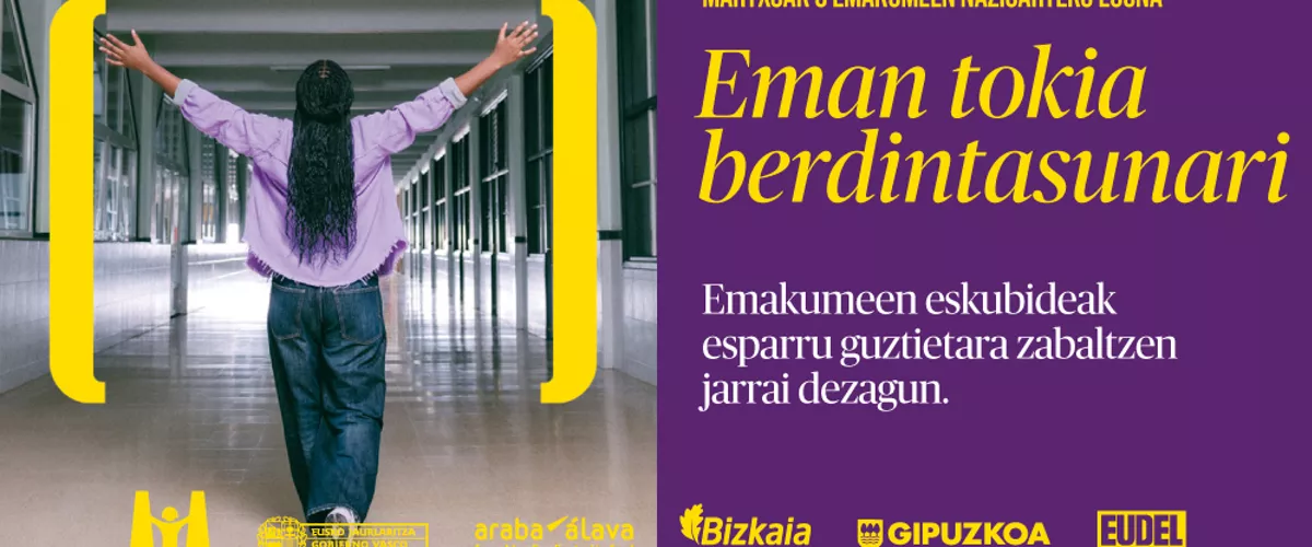 Eusko Jaurlaritzak adierazpena egin du Emakumeen Nazioarteko Eguna dela eta. "Eman tokia berdintasunari" kanpainarekin aldarrikatu du berdintasunean aurrera egiteak berarekin dakarrela aurrera egitea eskubideetan, askatasunean, ongizatean, errespetuan eta pertsona guztientzako aukera-berdintasunean.