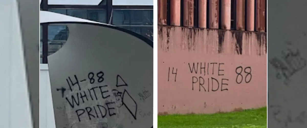 Talde naziek erabili ohi dituzten ingelesezko aldarrikapenak irakurtzen dira, hala nola "harrotasun zuria" eta 1488 zenbakia, banda neonaziei lotutakoa.