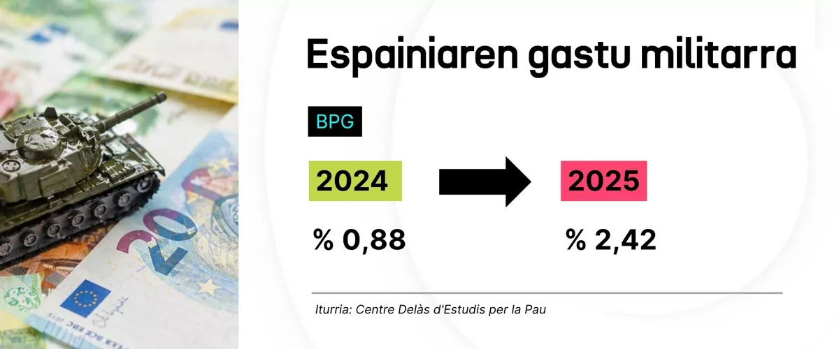 Centre Delàsek astelehen honetan aurkeztu duen txosten batean izaera militarreko gastuak gehitu dizkio Defentsa Ministerioko aurrekontuari; hala nola, ikerketarako partidak, atzerriko operazioak, partida industrialak eta abar. Horrek guztiak BPGren % 2,42ra igotzen dutela salatu du.