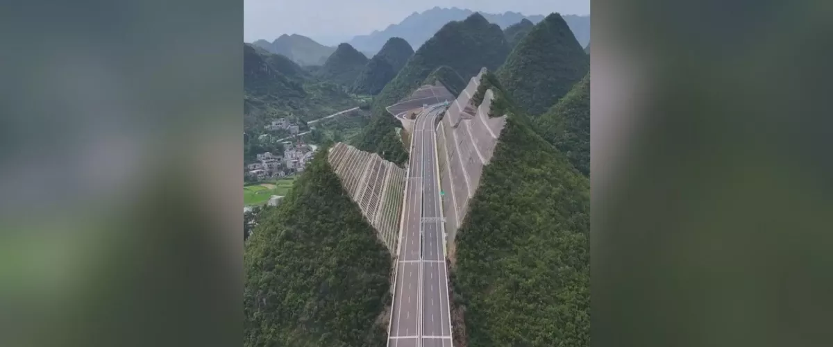 Guizhou probintzian, ingeniariek mendia zatitu dute autobide moderno bat eraikitzeko. Lehergaiak eta zulatzeko teknika aurreratuak erabili dituzte korridore zabal bat sortzeko.