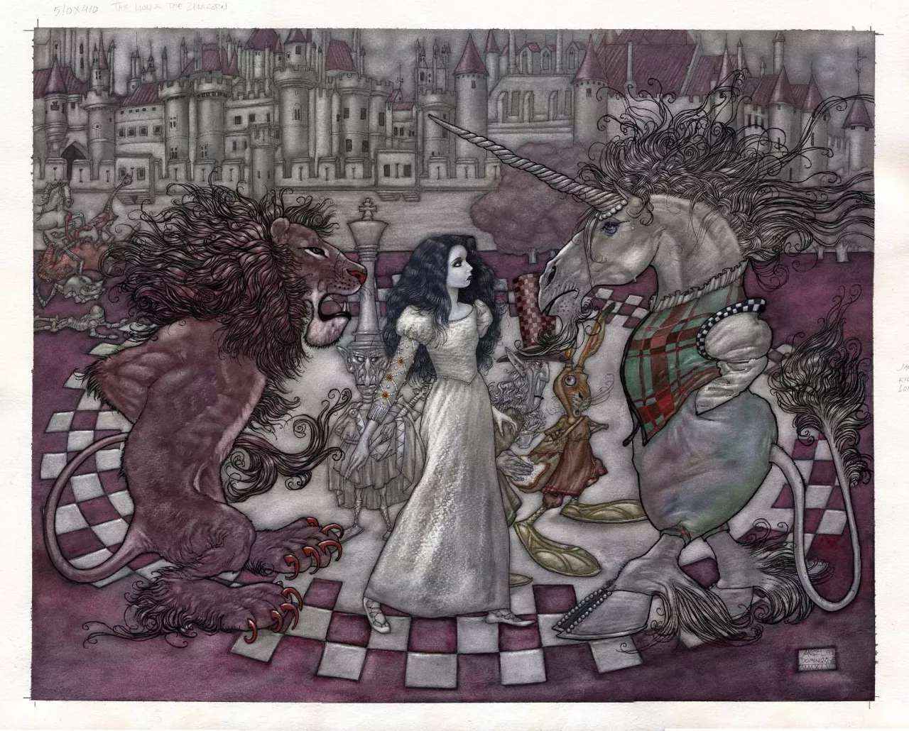 "Bi Alice agertzen dira nire liburuan: bata, ilehoria, nire lehen liburuko pertsonaia bezalakoa. Bestea, ostera, ile beltz luzekoa, Alice ilehoriak ametsetan amesten duena. Txikitan oso ohikoa den ametsa irudikatu nahi izan dut; alegia, beste bat garela eta beste horren larruan bizi ditugula desio ditugun abenturak". Ile beltzeko Alice, eta Zaldun Zuriaren eta Zaldun Gorriaren arteko borrokan, Carroll eta Domiguez aurrez-aurre, idazlea ilustratzailearen aurka, ilustratzailea idazlearen aurka. Eta hori baino gehiago: "Alicen lehen marrazkilariak, Tennielek, Carrolli esan zion ez zuela The wasp in a wig ( liztorra ileordearekin) kapitulua irudiztatu nahi, gogoko ez zuelako. Bada, kapitulu horrekin liburu bat egin dut nik. Nire ustez, istorio interesgarria da, Aesoporen alegia gogora ekartzen didana. Asto bat duen errotari bat kritikatzen dute, egiten duena egiten duela. Liztorrari gauza bera gertatzen zaio. Ileordea daramalako kritikatzen dute, eta ileorderik eramaten ez duelako ere bai. Lao Tzuk idatzi zuenez, jendearen oniritziaren bila ari bazara, jendearen iritziaren gatibu izango zara". Hitzok tinko itsatsita gelditu zaizkio artistari, ameslari nekaezina eta sortzaile librea baita.