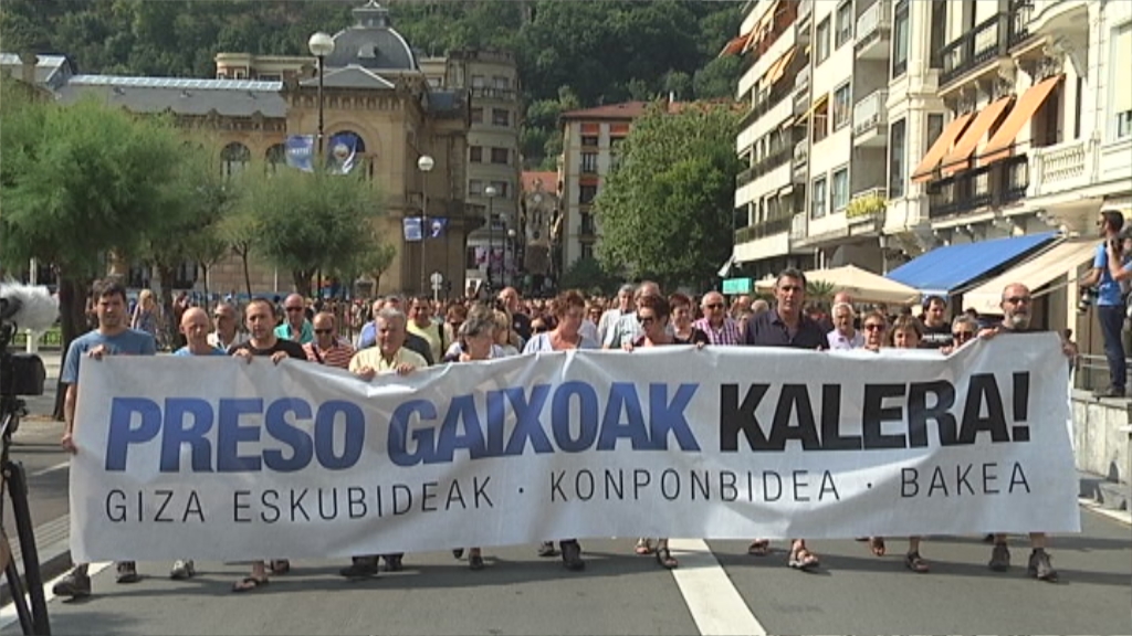 Osasun egoera larrian dauden presoak aske uztea eskatu dute gaur, Donostian. Boulevardetik abiatu da manifestazioa, 17:00etan. 'Preso Gaixoak Kalera! Giza eskubideak, konponbidea, bakea' lelopean, milaka lagunek zeharkatu dute hiriburua. Manifestazioaren amaieran, Zuloaga plazan, adierazpen bat irakurri dute: "Egoera jasanezina da. Ahalik eta tratamendu duinena behar dute, eta hori kartzelan ez da posible. Gauzak alda daitezke, egoera bidegabeak aldarazi ditzakegu. Posible da", aldarrikatu dute.