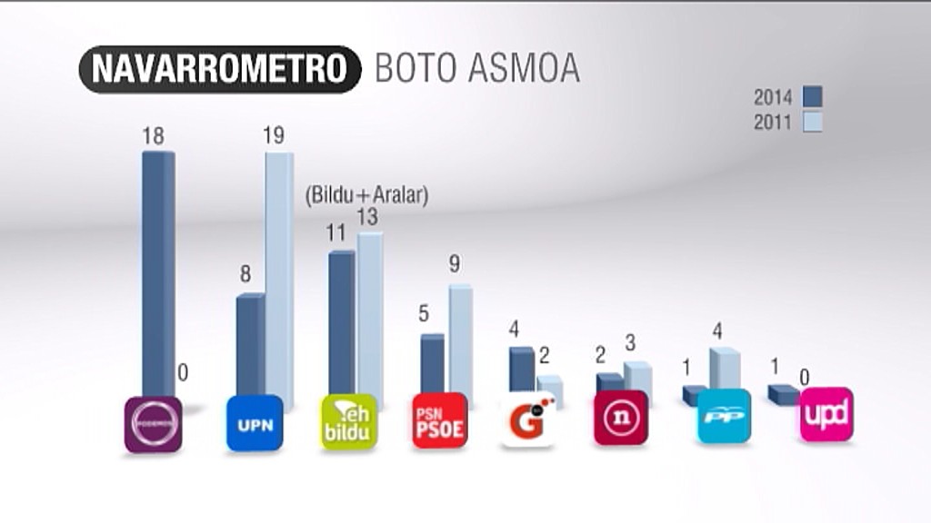 Hain zuzen ere, Pablo Iglesiasen alderdiak 50 eserlekuetako 18 lortuko lituzke. Bigarren postuan EH Bildu egongo litzateke, 11 diputaturekin (egun, Bilduk 7 ditu, eta Aralar-NaBaik, 6), eta ondoren honakoak izango lirateke: UPN, 8rekin (11 gutxiago); PSN, 5ekin (4 gutxiago); Geroa Bai, 4rekin (2 gehiago); Izquierda-Ezkerra, 2rekin (1 gutxiago); PP, 1ekin (3 gutxiago), eta UPyD, 1ekin.