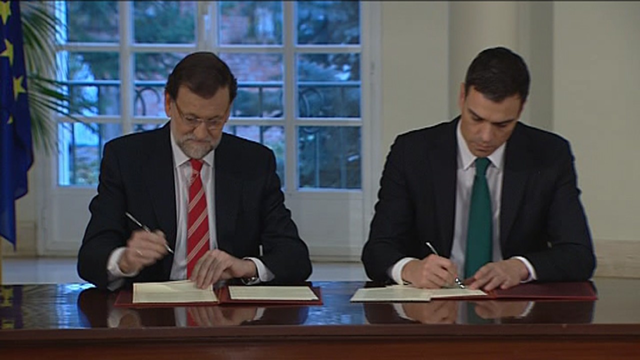 Mariano Rajoy Gobernuko presidenteak eta Pedro Sanchez Alderdi Sozialistako buruzagiak terrorismo jihadistaren aurka borroka egiteko ituna sinatu dute arratsaldean, Moncloako Jauregian.