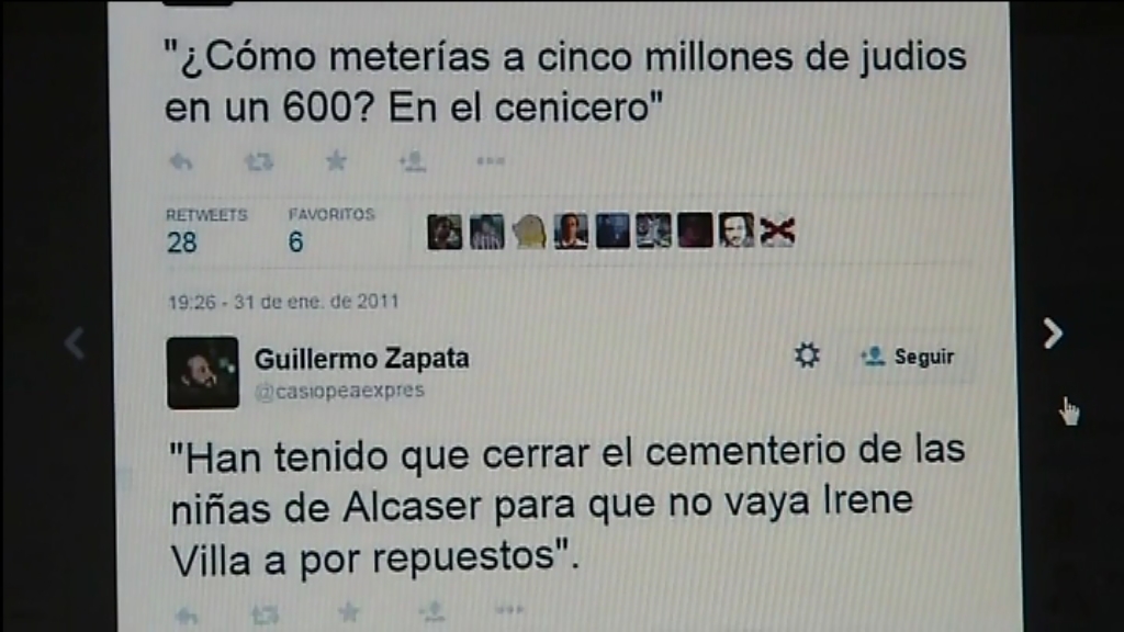 Adibidez, txio batean, honakoa idatzi zuen: "Nola sartuko zenituzke 5 milioi judu 600 auto batean? Hautsontzi batean". Beste hainbat mezutan antzeko txisteak egin zituen Irene Villa ETAko biktimaren edo Marta del Castilloren kontura. Horregatik, PPk, PSOEk eta Ciudadanosek horren dimisioa eskatu dute.
