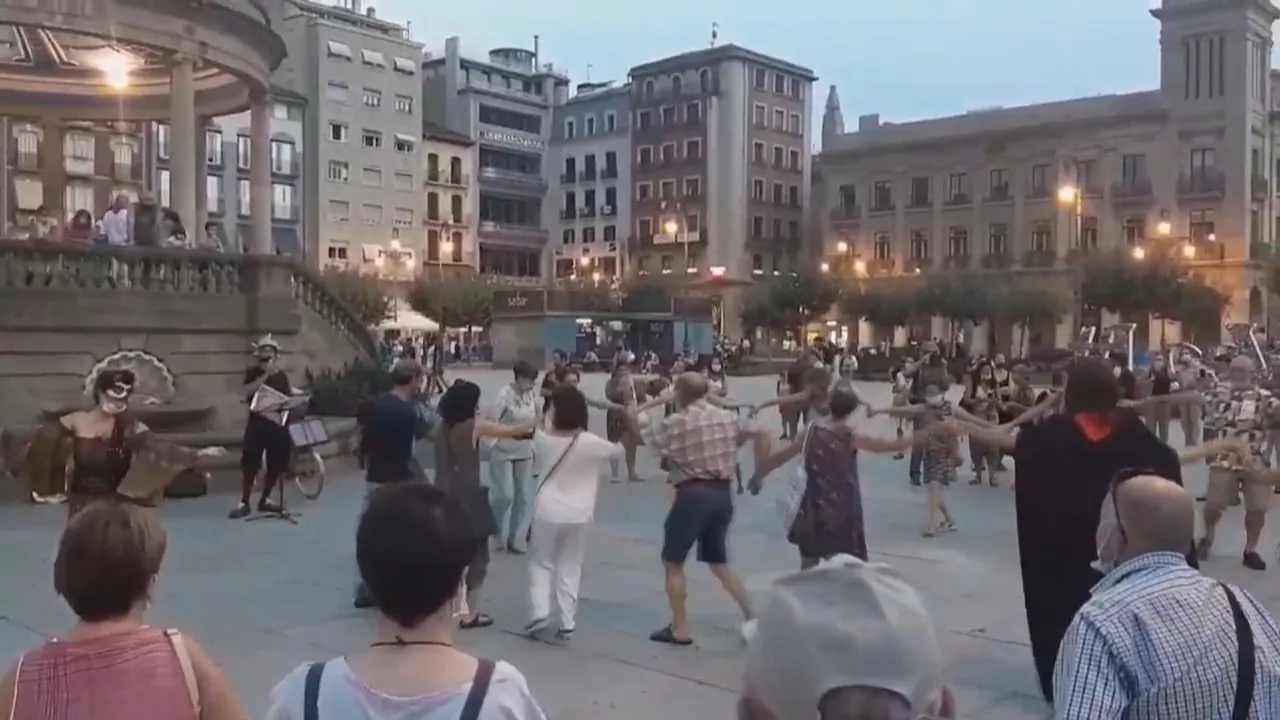 20 bat pertsona maskararik gabe eta eskuetatik helduta dantzan, "COVIDa ez duela birus batek eragiten, baizik eta 5G telefono mugikorretarako teknologia berriak", aldarrikatu zuten larunbatean.