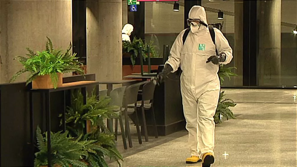 Ertzaintzako hainbat kide desinfekzio lanak egiten ari dira Bilboko geltoki Intermodal berriaren kanpoaldean zein barruan.