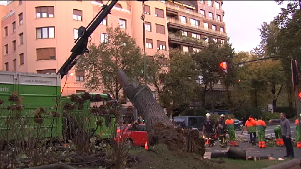 100 kilometro ordutik gorako haizeak kalteak eragin ditu Bilbon. Tranbiaren ibilbidea etenda dago Sabino Arana parean zuhaitz bat bota duelako haizeak.