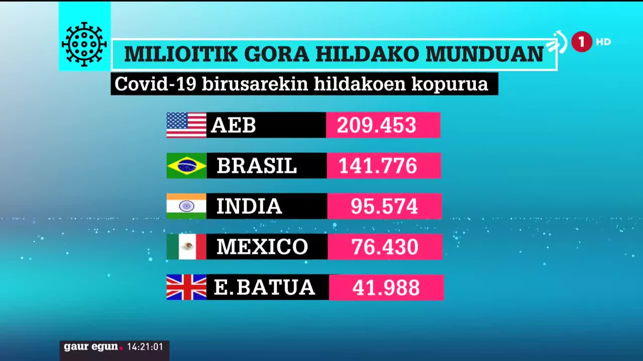 204.480 pertsona hil dira AEBn eta 141.000 Brasilen (horiek dira biktima gehien dituzten herrialdeak). Europan, Erresuma Batuan hil du koronabirusak jende gehien: 41.971.