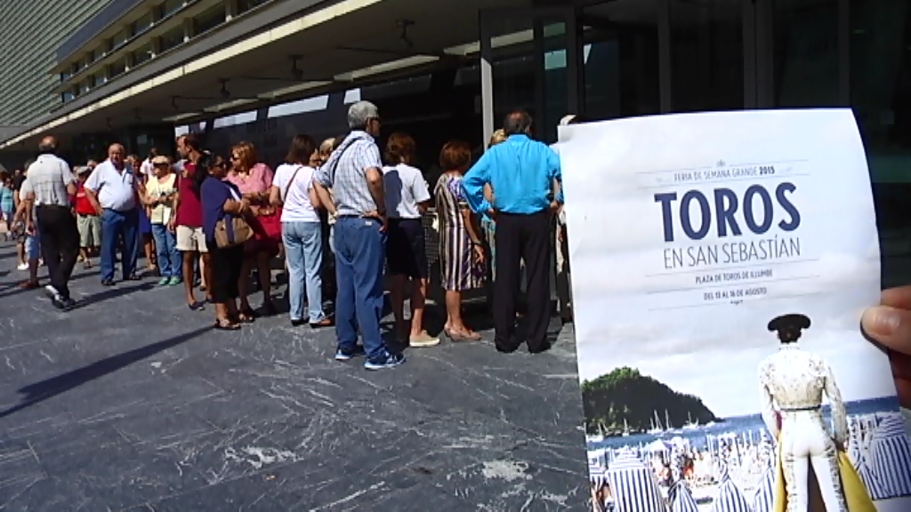 Donostiako zezen zaleek ilara luzea osatu dute gaur goizean Kursaal jauregi aurrean Aste Nagusiko zezenketetarako sarrerak erosteko.