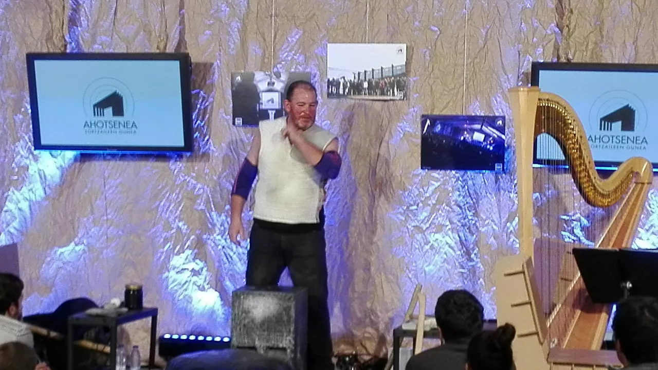 “Harria maitasun istorioa” bakarrizketa egin du Iñaki Perurena harri-jasotzaileak Durangoko Azokan, Ahotsenea Solasaldiak gunean.