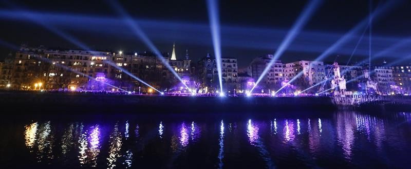 Victoria Eugenia antzokian egin den ekitaldi instituzionalaren ostean, milaka lagun bertaratu dira Maria Cristina zubi inguruetara argia, ura eta musika uztartu dituen ikuskizuna ikustera.