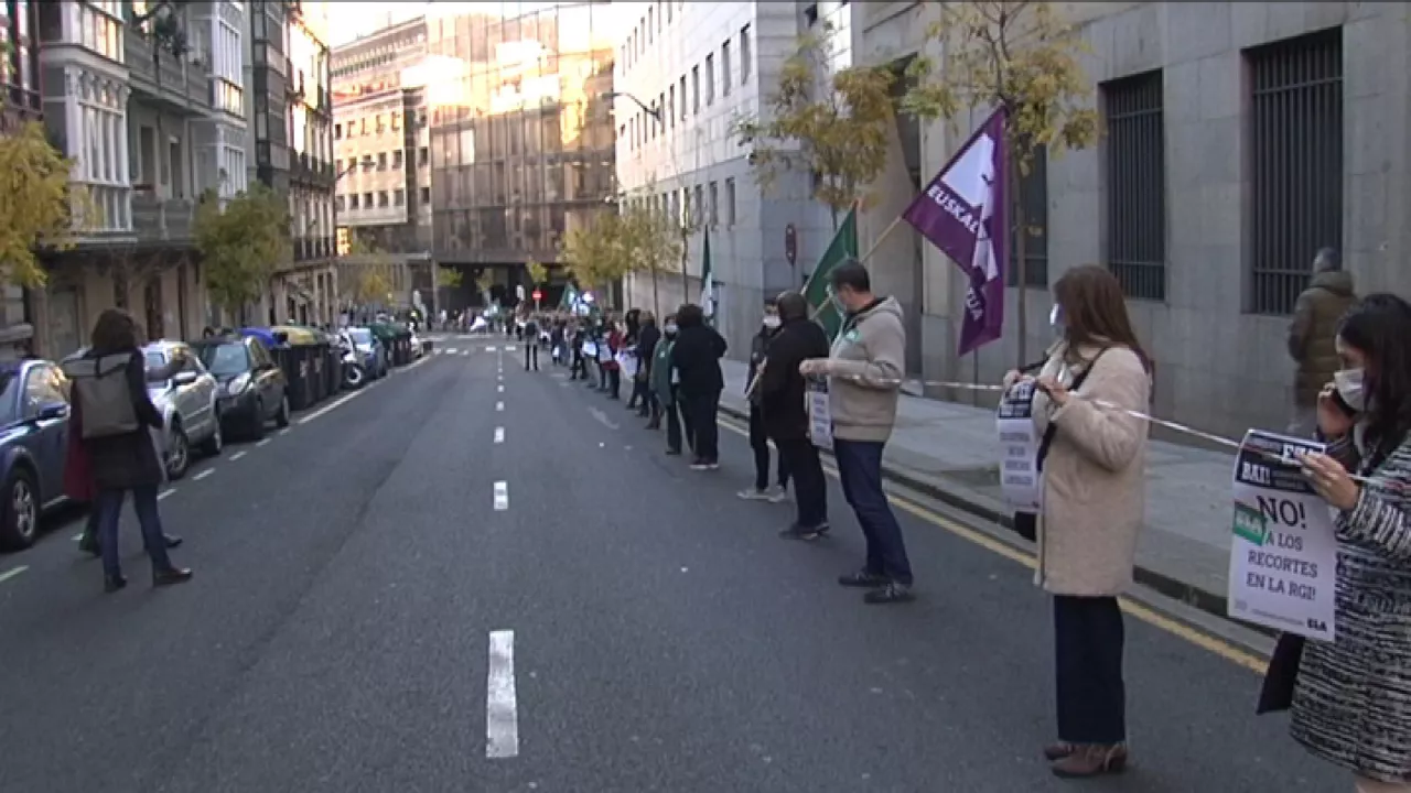 ELA sindikatuko ordezkariek giza katea osatu dute gaur EAJk eta EH Bilduk Bilbon dituzten egoitzen artean, aurrekontuak "kontinuistak eta antisozialak" direla salatzeko.