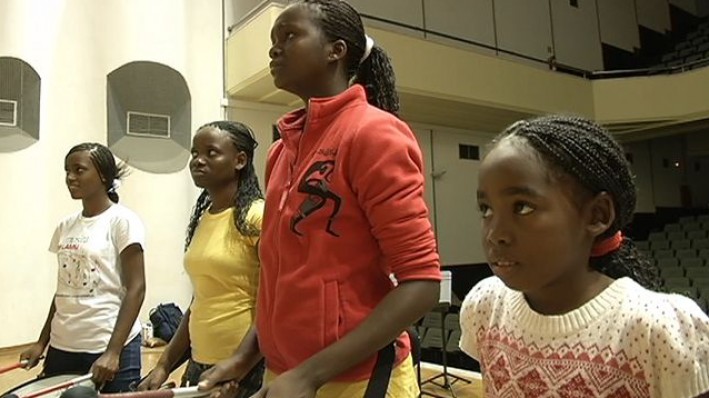 Neska-mutiko perkusiogile kenyarrak, EOSen ikasleekin entseguan