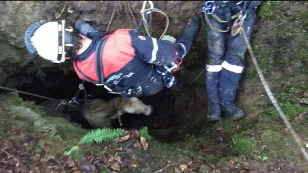 Korapilatsuak izan dira 400 kiloko behia bost metro sakonerako leitzetik ateratzeko lanak. Ojitos izena jarri diote erreskatatu duten suhiltzaileek.