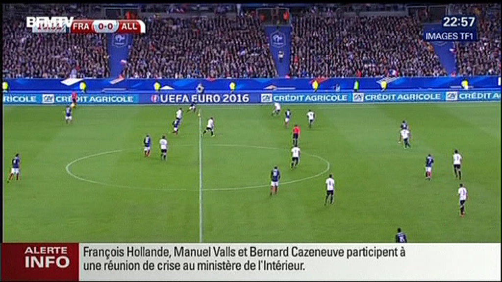François Hollande Frantziako presidentea Frantzia-Alemania partida ikusten zegoen Saint Denis estadioan, Parisen, erasoak izan ziren unean. 80.000 pertsona inguru batu ziren estadioan.