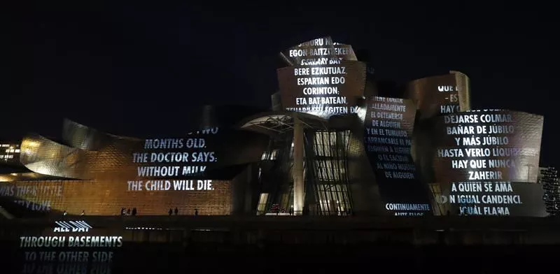 Jenny Holzer artista estatubatuarraren erakusketa aurkezteko 19 idazleren testuak proiektatu zituzten bart Guggenheim Museoaren fatxadan.