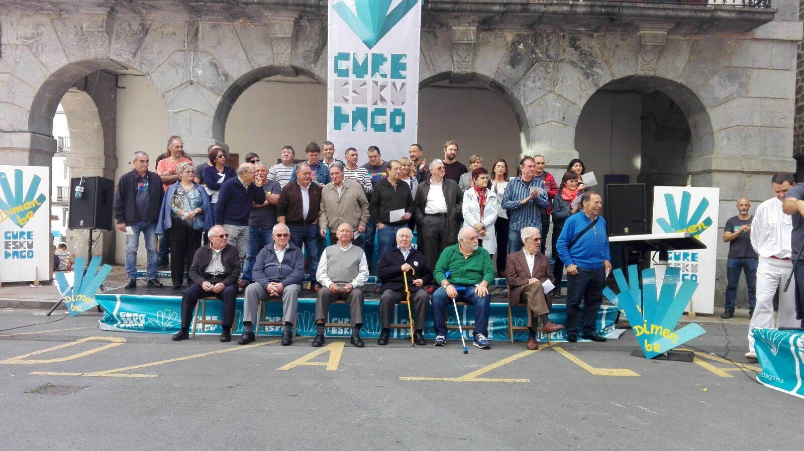 Demokrazia garaiko berrogei zinegotzi eta alkate inguruk bat egin dute gaur Diman, Gure Esku Dagok azaroaren 27rako deitu duen herri-galdeketari babesa adierazteko.