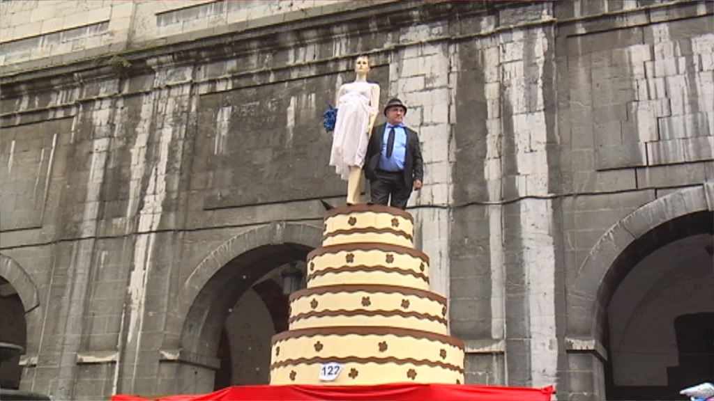 Juan Karlos Izagirre Donostiako alkateak hiriaren aginte-makila eman dio Momo jainkoari, hiriburuko udaletxean egin duten ekitaldi batean.