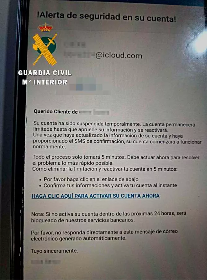 Bankuko kontua behin-behinean blokeatu dietela ohartarazten diete gaizkileek erabiltzaileei, testuarekin batera jartzen duten helbidean klik egin dezaten.