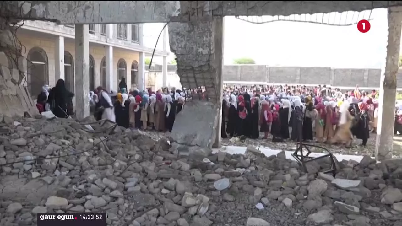 Ehunka haurrek hondakinen artean ikasten dute Taizen (Yemen)