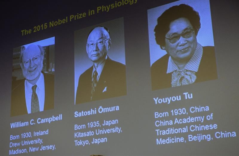 William Campbell irlandarra eta Satoshi Omura japoniarra. Hirugarren saritua emakumea da:Tu Youyou txinatarra.