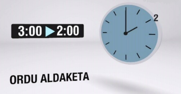 Martxoaren 26an erlojuak ordubete aurreratu ditugu eta goizeko 02:00etan 03:00ak izan dira.