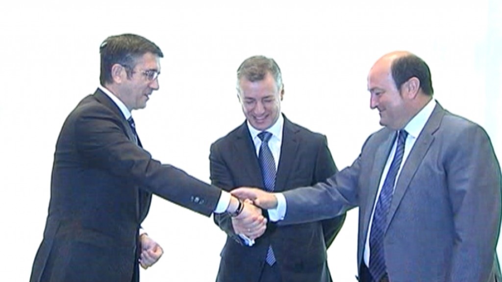 Iñigo Urkulluk, Andoni Ortuzarrek (EAJ) eta Patxi Lopezek (PSE) sinatu dute ituna, Lehendakaritzan.