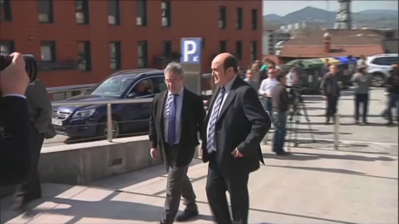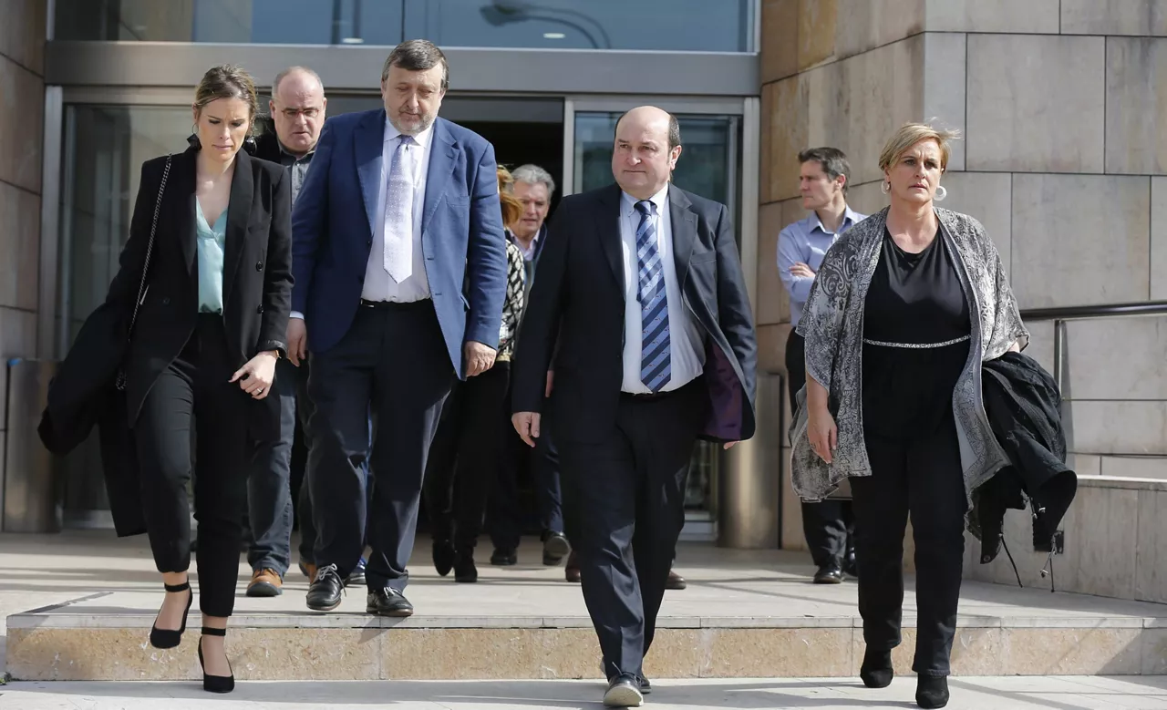 Xabier Arzalluz, aterkia eskuan, 'Eusko Gudariak' abesten Bilboko Justizia Jauregiko eskaileretan. Barruan, Atutxa, Knörr eta Bilbao zeuden inputatu gisa deklaratzen.