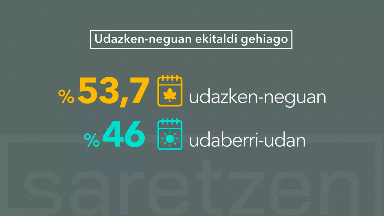 La culture est vivante toute l'année dans la CAE, mais elle ne vit pas de la même façon à toutes les saisons. Selon l'analyse réalisée par Saretzen avec tous les événements recueillis par Kulturklik en 2024, la programmation culturelle est répartie de manière assez équilibrée entre les saisons, bien qu'un peu plus soit prévu pour l'automne et l'hiver, où 53,7 % des événements ont eu lieu.